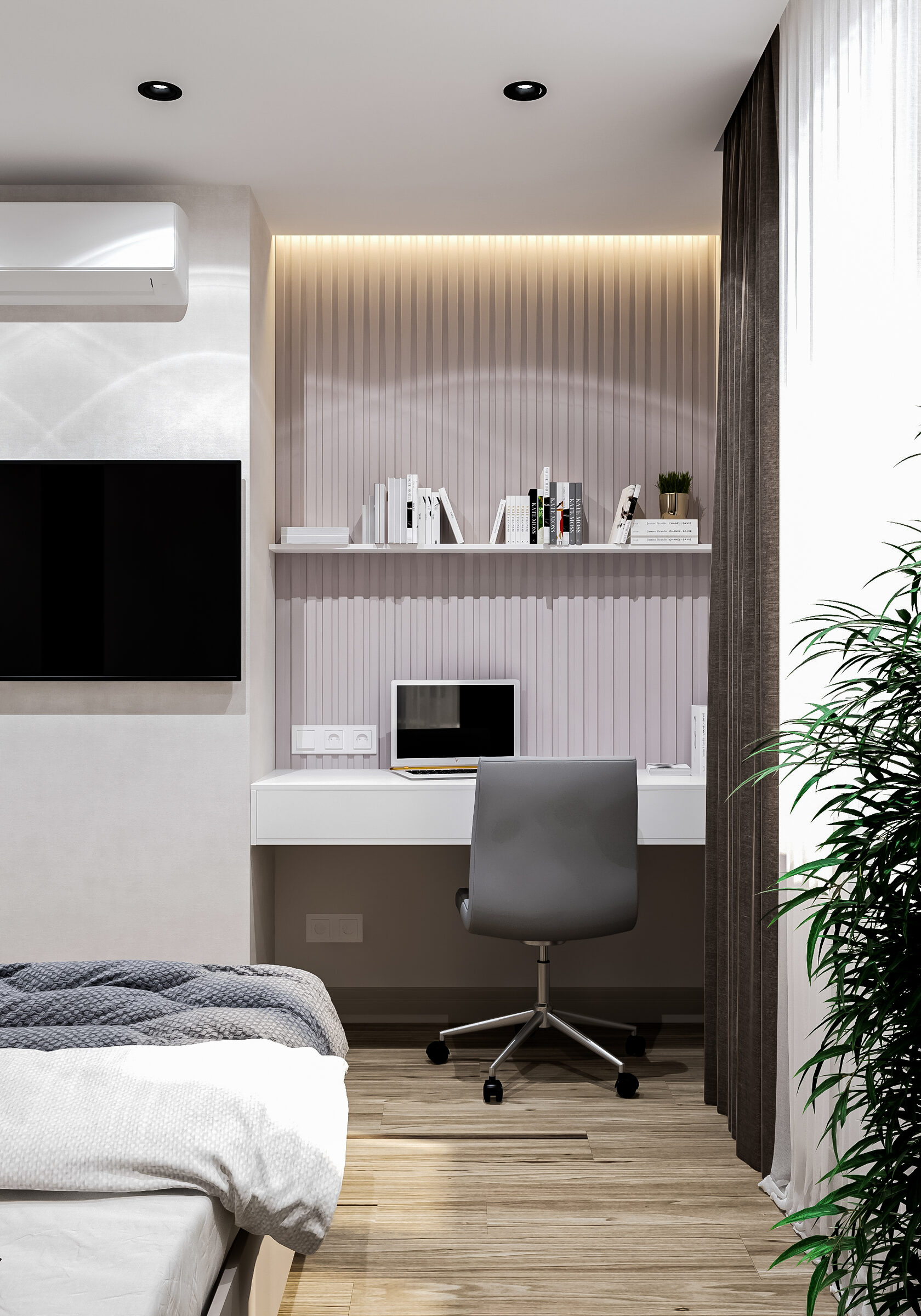 В спальне Акцентом стало изголовье кровати со скрытой подсветкой, зеркалом и панелями из дюрополимера под покраску.