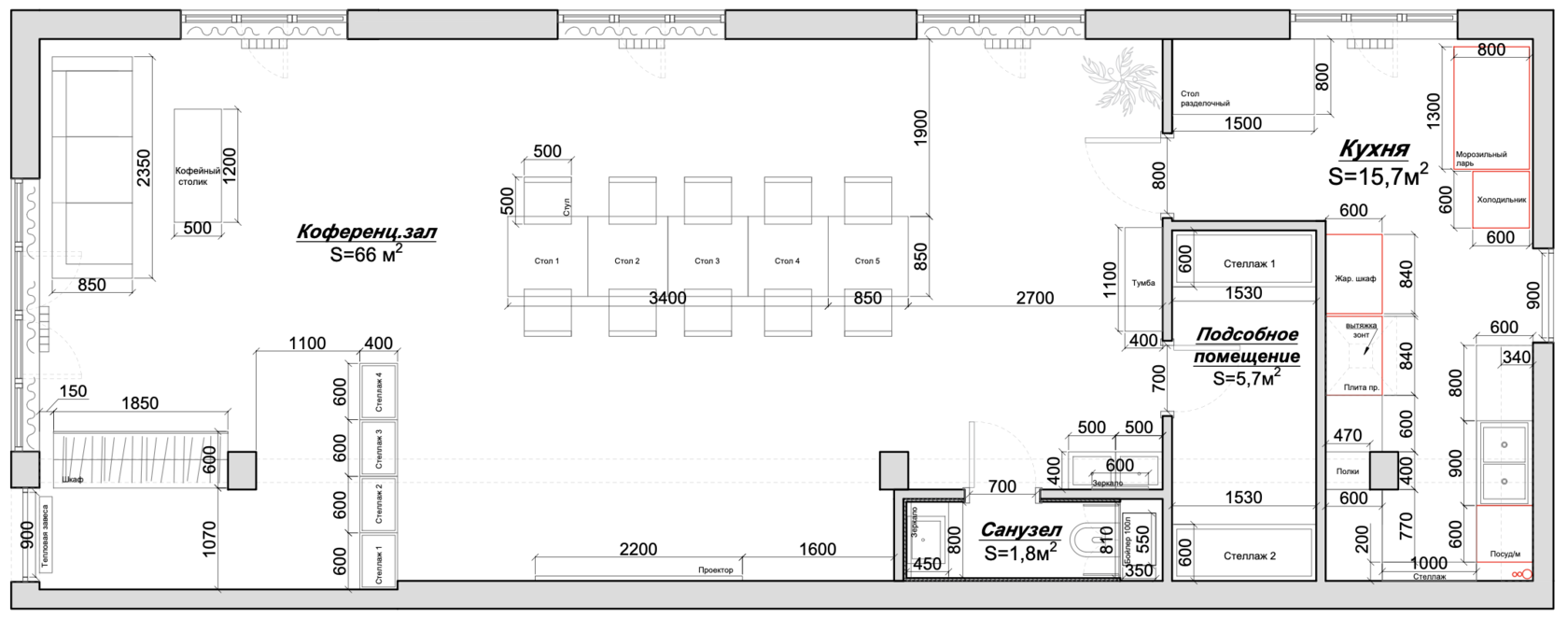 Общая площадь помещения составляет 96,6кв, что позволило разделить его на 4 зоны: конференц-зал, полноценную кухню, уборную и подсобное помещение.