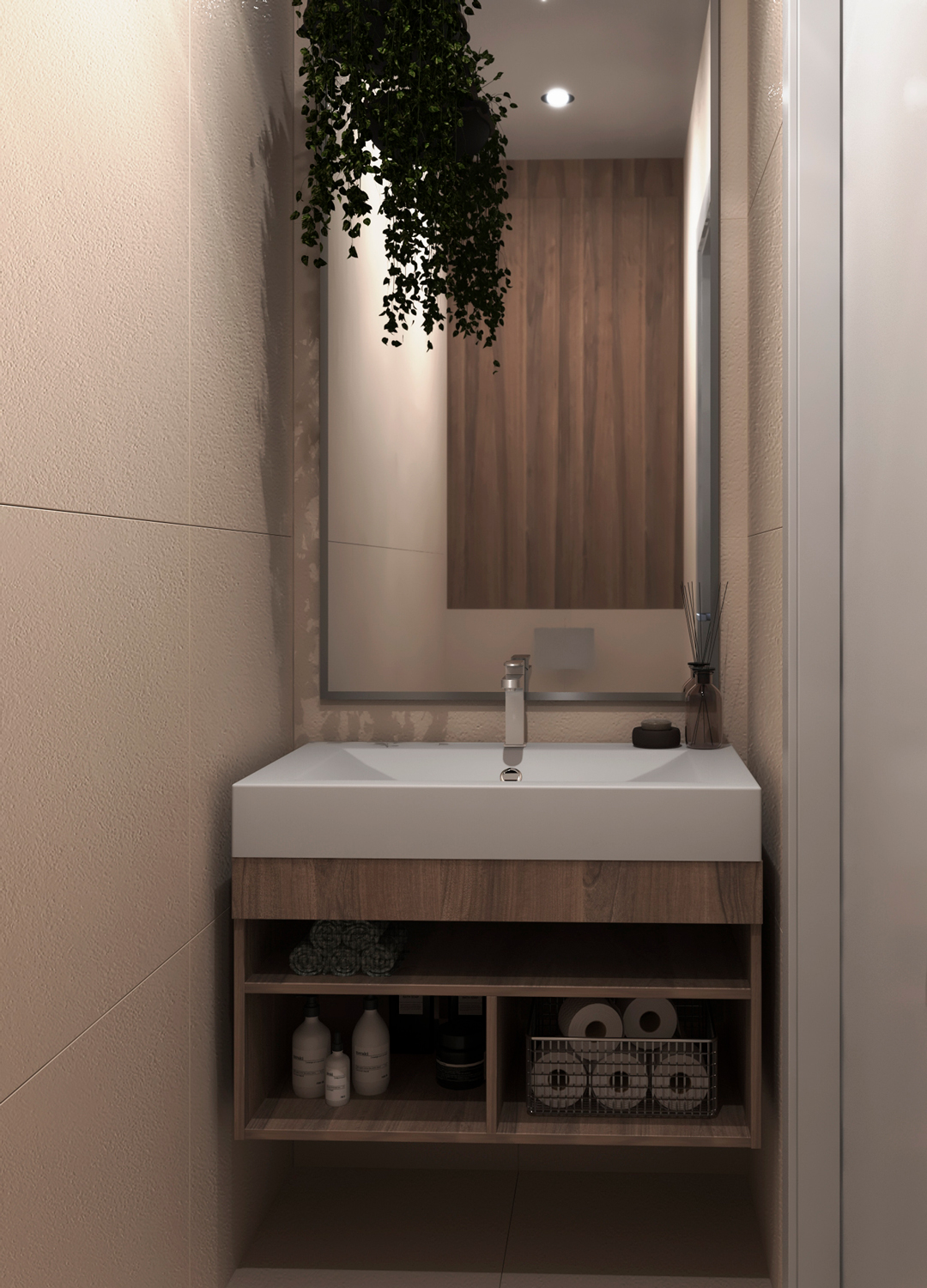 Уборная и подсобное помещение поддерживают общую стилистику помещения, также выполнены в оттенках бежевого и древесного.