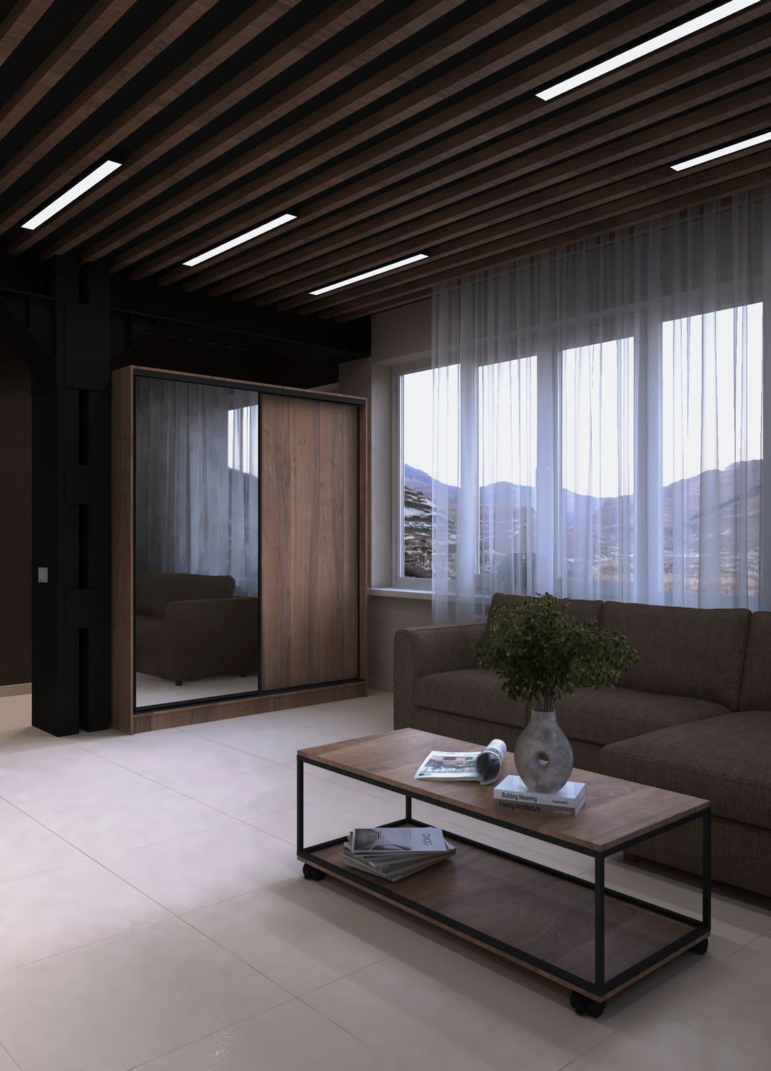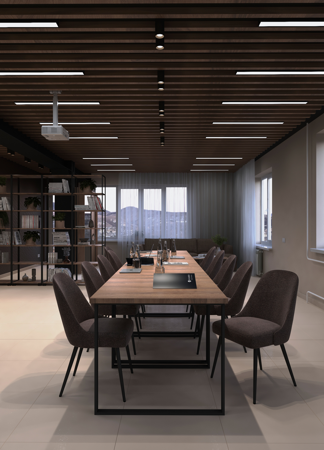 Конференц-зал выполнен в оттенках бежевого и шоколадного цвета, с акцентом на черной ферме и рейках на потолке. Мебель из древесных материалов с добавлением металла создает уютную атмосферу. Конференц-зал разделен на несколько зон: вход с вместительным шкафом для верхней одежды, зона ожидания с диваном и кофейным столиком, а также основная часть зала, огороженная металлическими стеллажами с озеленением.