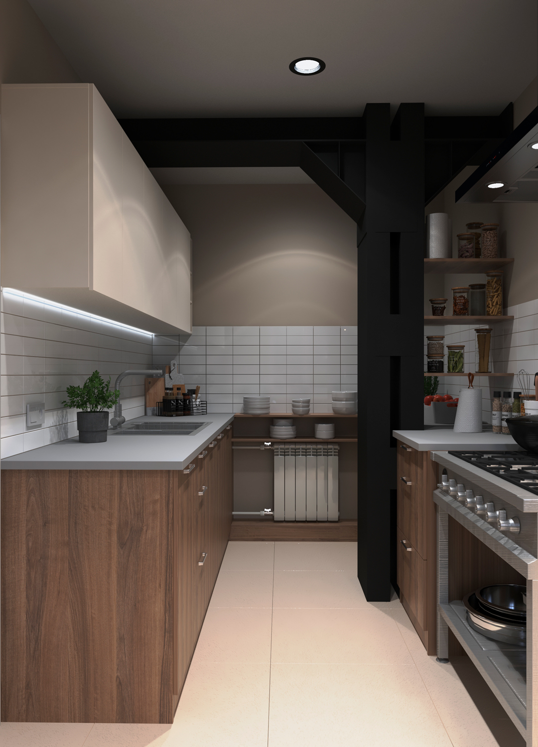 Кухня, занимающая 16 кв, выполнена в нейтральных оттенках, с фартуком из плитки "кабанчик". Главной целью было правильное расположение промышленной плиты и печи, а также морозильного ларя.