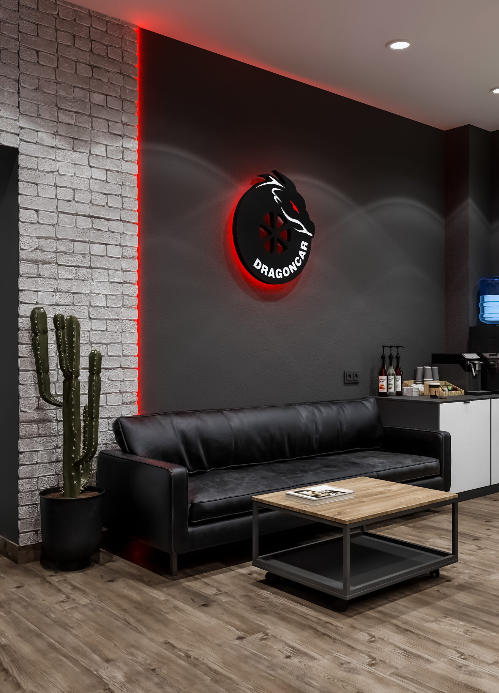 Оговаривался строгий мужской интерьер, с добавлением акцентов, которыми в дальнейшем стали неоновые вывески и красная вертикальная LED подсветка.