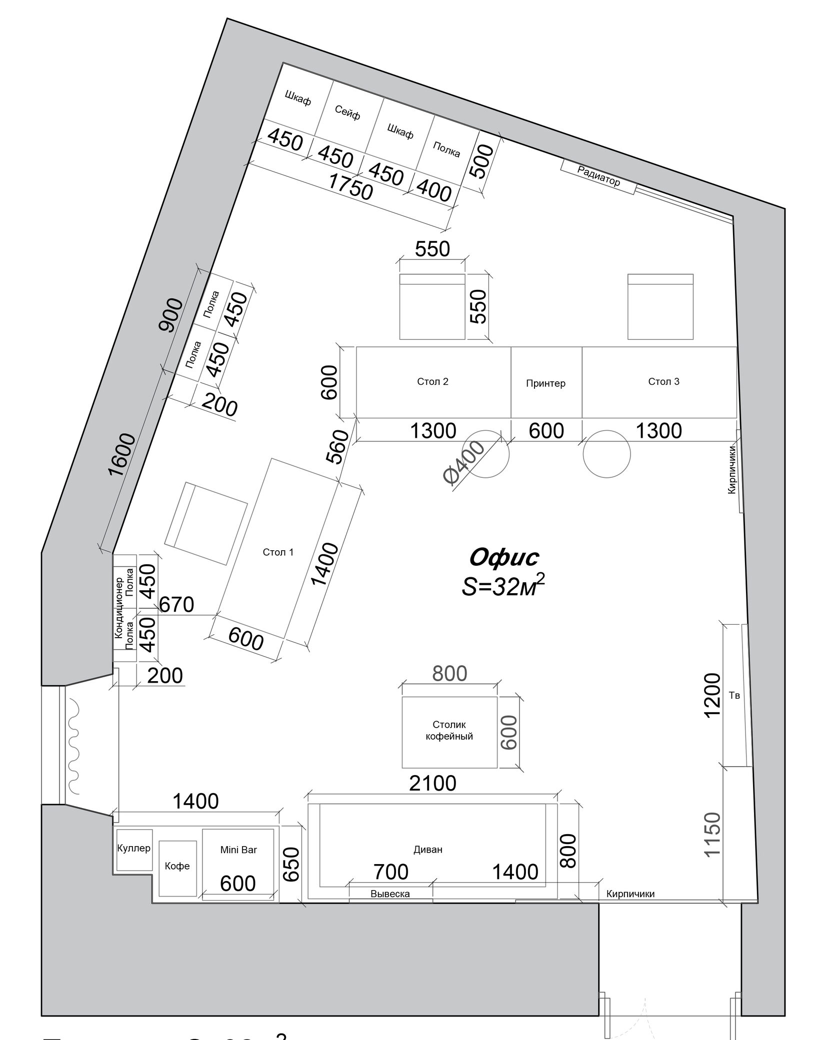 При планировке помещения были учтены три рабочих стола, с учетом особенностей нескольких диагональных стен.