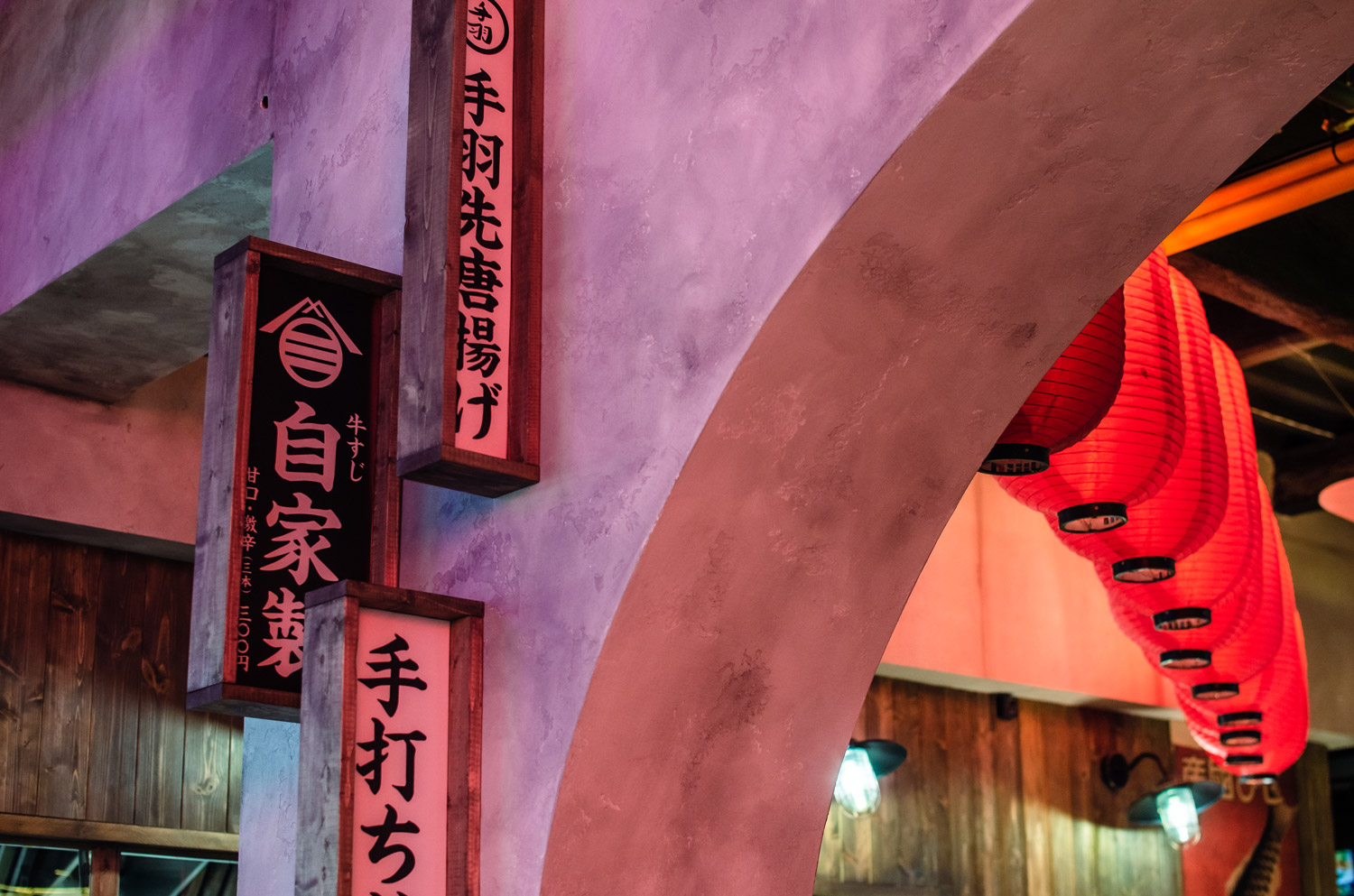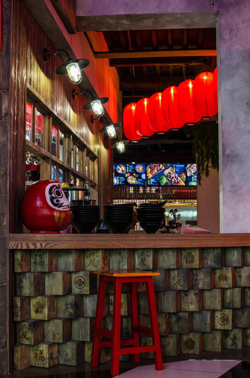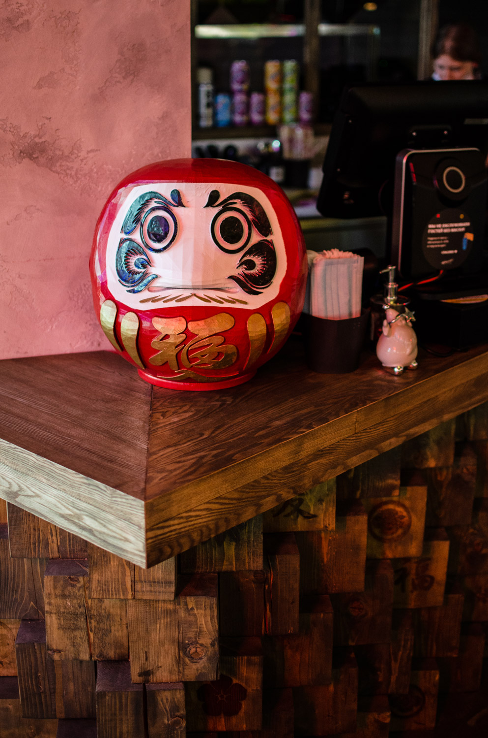 • На внешнюю часть корнера был распилен брус на кубики и нанесены гравировки с японскими надписями и знаками кланов